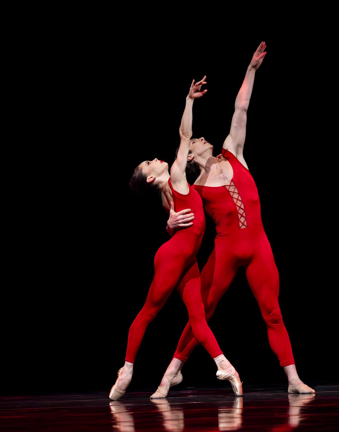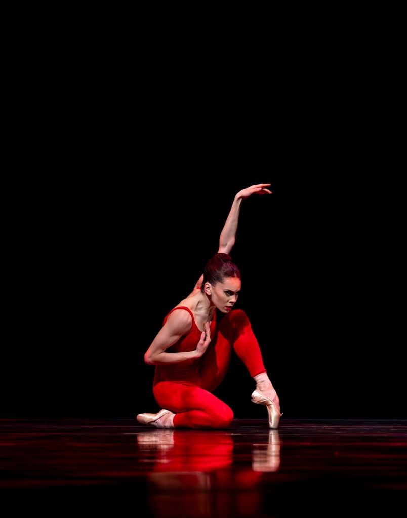 As this frenzy of sound fills the room, fire-engine red light floods the stage, where four dancers in bright red leotards appear to step off their marble pedestals before going absolutely feral for about twenty minutes. The opening-night cast included soloist Amanda Morgan, along with principals Lucien Postlewaite, Christopher D’Ariano, and Clara Ruf Maldonado. All were superb, but Postlewaite and Maldonado were something else.